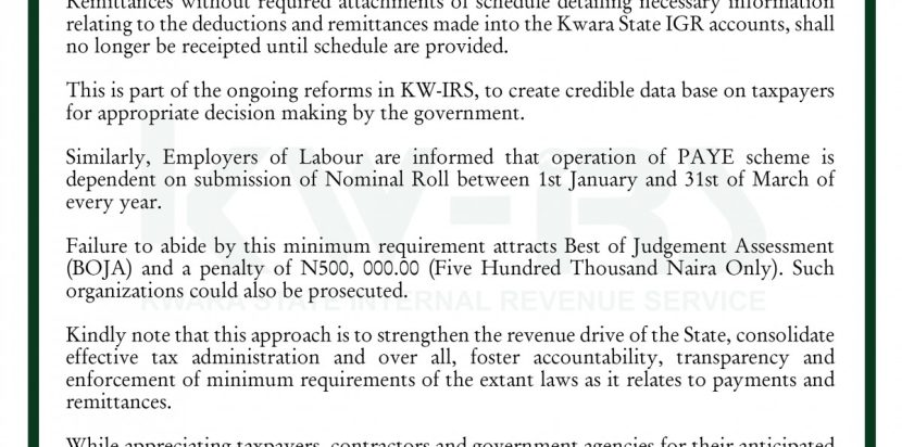 The Kwara State Internal Revenue Service (KW-IRS), notifies the general public that issuance of Tax Clearance Certificate and Receipt for remittances/payments of Pay-As-You-Earn (P-A-Y-E), Withholding Tax (WHT), Development Levies and other payments shall be based on submission of payment schedule. Remittances without required attachments of schedule