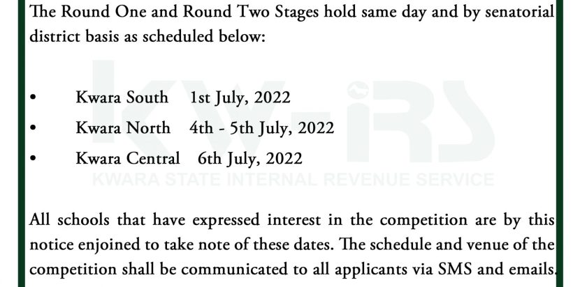 The Kwara State Revenue Administration Law, 2015 (Law No.6 of 2015) assigned on the 22nd of June, 2015 established and guides activities of Kwara State Internal Revenue Service (KW-IRS) and the law is accessible on the website of Service. • KW-IRS as an agency of the